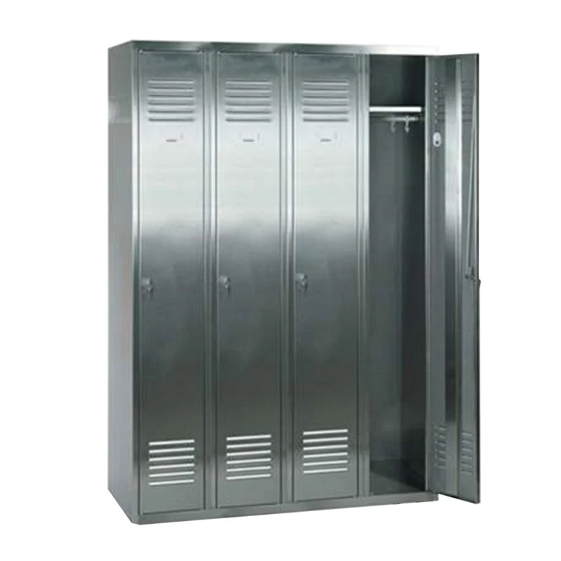Rozsdamentes acéllemezből készült, 300 mm széles, fém öltözőszekrény zárható, 2 kulccsal a készletben. A belső tartozékok: egy polc a felső részben, alatta ruhaakasztó rúd - 2 db kampóval, öntapadós tükör, névtáblatartó és egy akasztó.